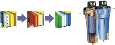 空气压缩机提供的压缩空气首先通入压缩空气净化中。压缩空气先由气水分离器、管道过滤器除去部分的油、水、尘,再经组合式干燥机进一步除油、水、尘,精过滤器除油、除尘,并由在紧随其后的超精过滤器进行深度净化。
